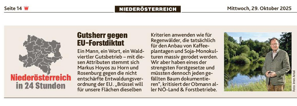 In einem Bericht der Kronen Zeitung vom 29. Oktober 2025 zum Thema Entwaldung und EU-Vorgaben kommen Landesverbandsobmann Markus Hoyos und Präsident Konrad Mylius zu Wort. Beide betonen, dass Österreichs Forstbetriebe seit Generationen nachhaltig wirtschaften und daher von überzogener EU-Bürokratie entlastet werden müssen. Hoyos kritisiert, dass heimische Betriebe mit tropischen Plantagen gleichgesetzt werden. Der Artikel ist online unter Öko-Absurdum - Kampf der heimischen Förster gegen EU-Walddiktat | krone.at nachzulesen.